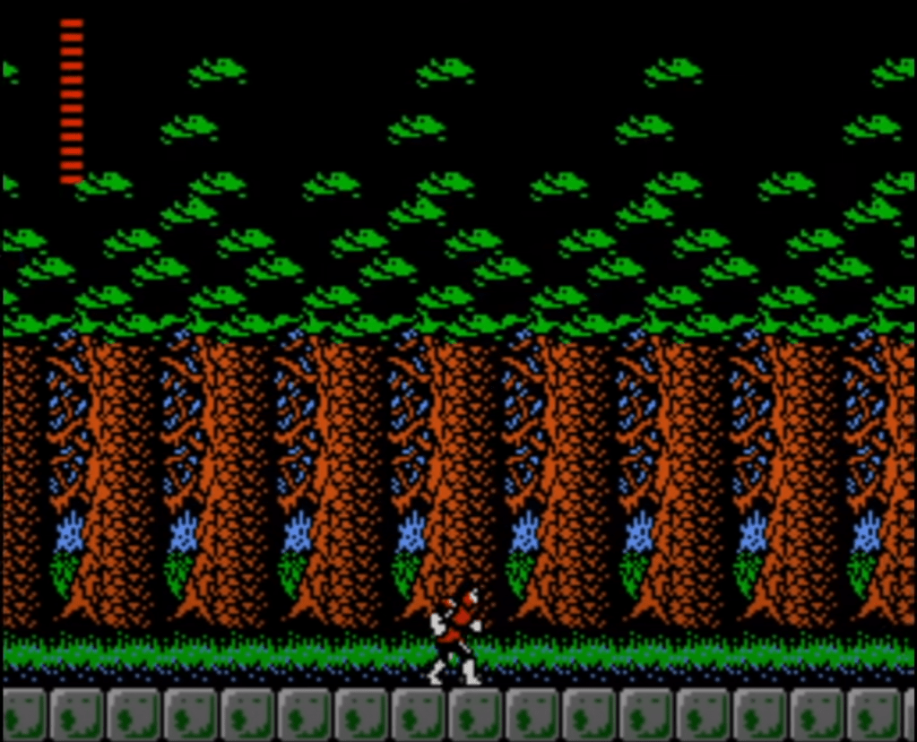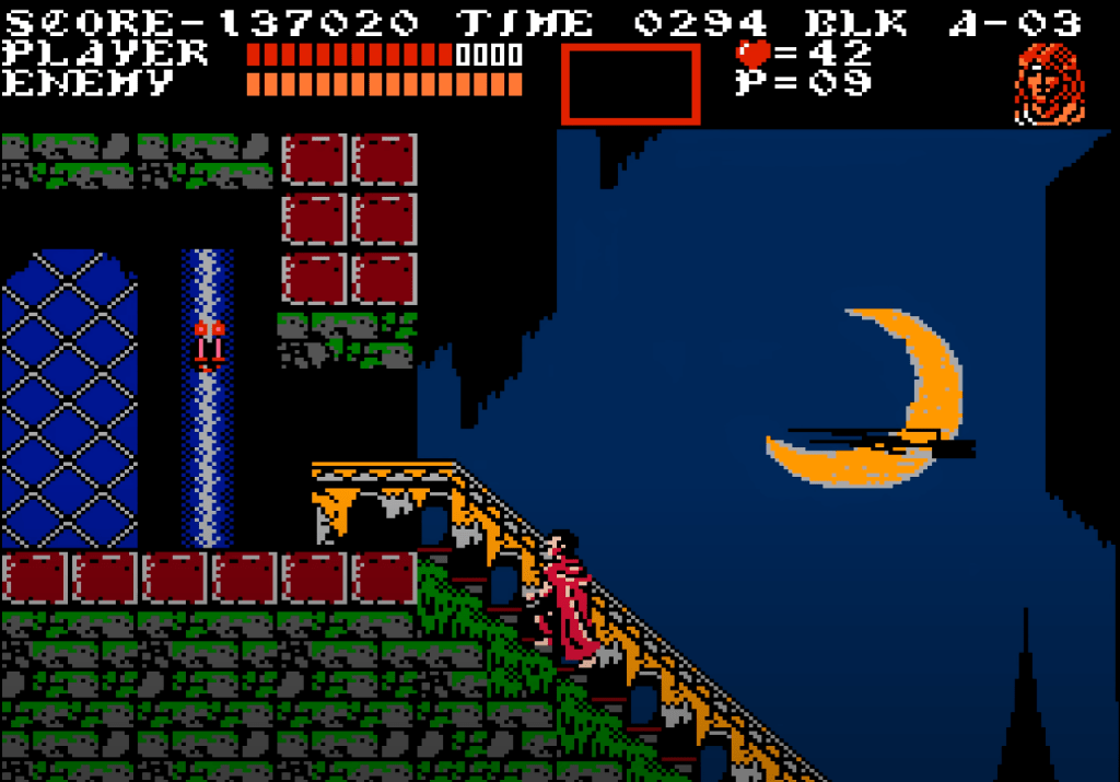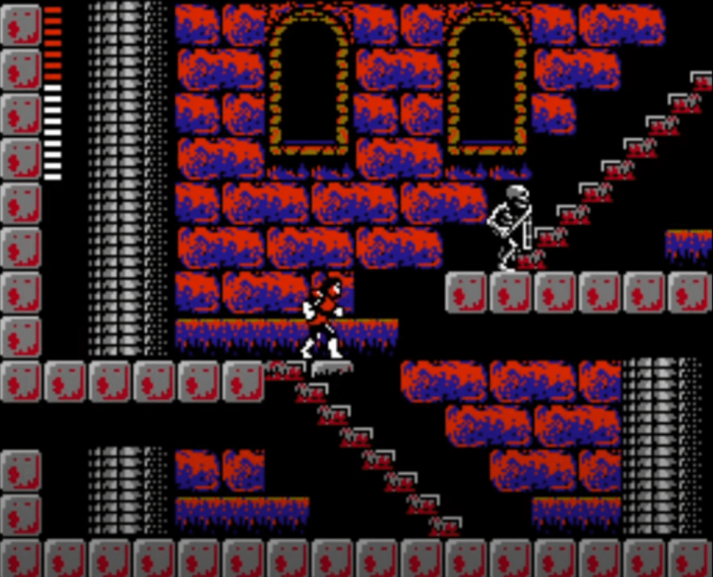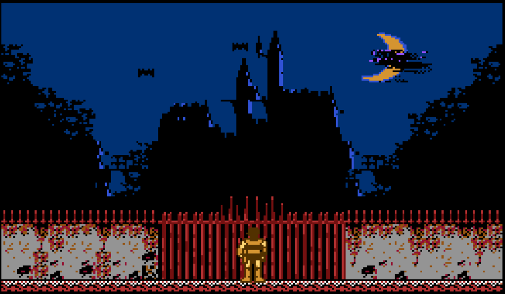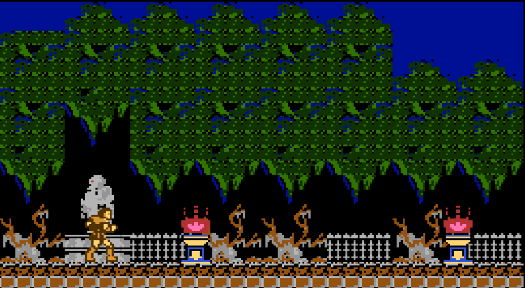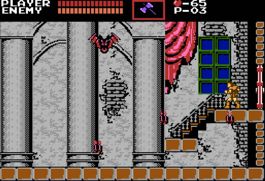 Todas as cenas aqui descritas, possuem detalhes criados pelo imaginário do jogador. Nessas cenas, repletas de pixels de várias cores, mal se pode chamar o conjunto de pixels cinzas, de estátua, muito menos de um cavaleiro. Assim eram muitos jogos nessa época. Imagens que davam a sugestão do fantástico, medonho ou macabro, o restante era questão do quanto a mente do jogador se permitiria afundar nesse mundo formado por pixels. E é aqui, que Simon tem seu súbito surto de raiva, onde começa a quebrar todos os braseiros, candelabros ou qualquer coisa que posso sequer parecer com um. Acredito ser genuinamente engraçado, vampiros guardarem armas e munições para as mesmas com seus monstros, e escondidas em seus candelabros e braseiros. E também, Simon pode encontrar escondido dentro de paredes falsas do castelo, itens de cura, simbolizado por um frango assado em um prato de prata. É muita gentileza de nosso anfitrião, Drácula. Pois, claro, o jogador precisa de itens para ficar mais forte, para se curar e etc… Coisa essa, diga-se de passagem, que foi copiada e reformulada por vários outros jogos de diferentes gêneros durante a história.