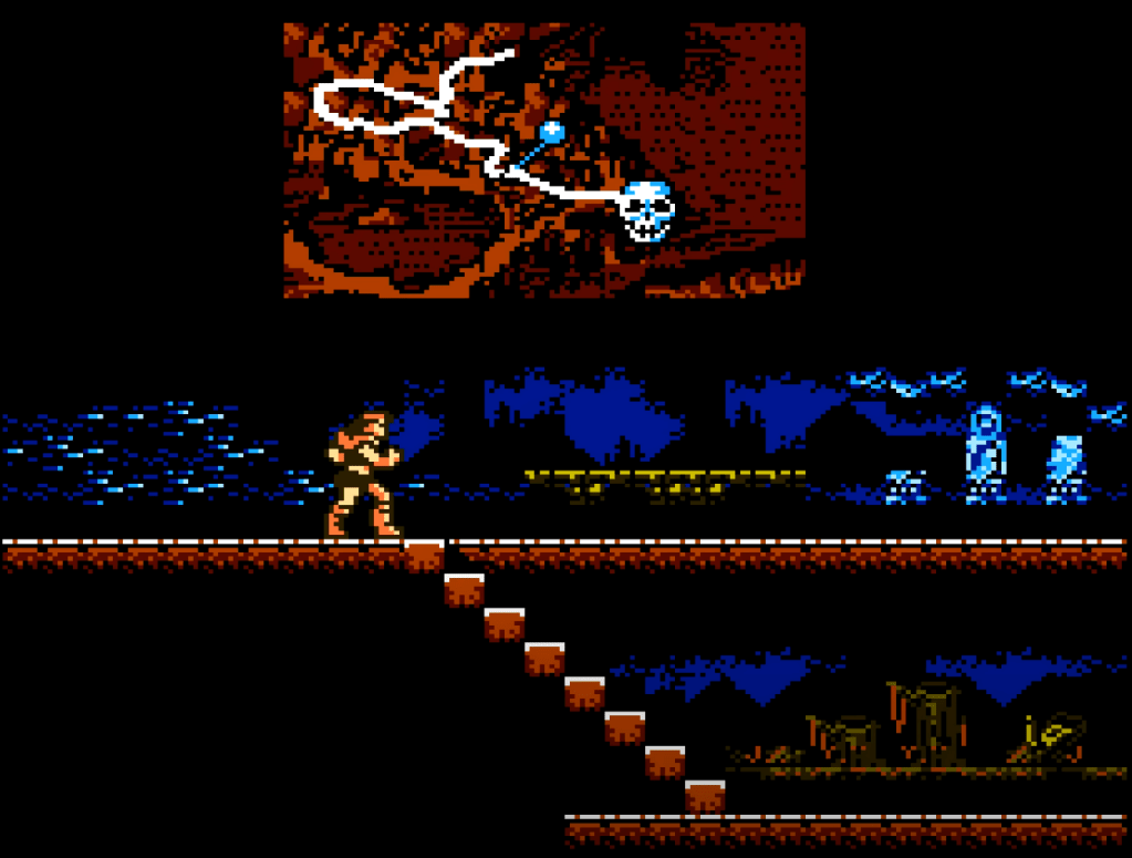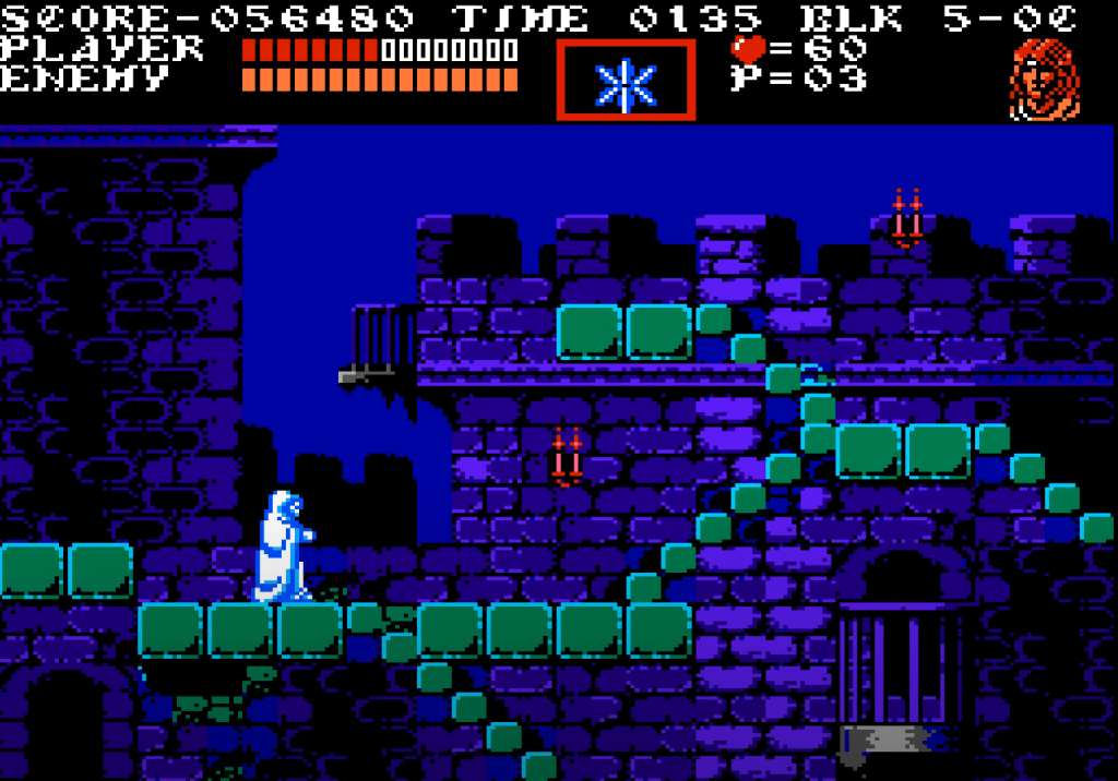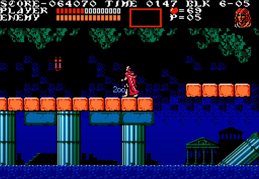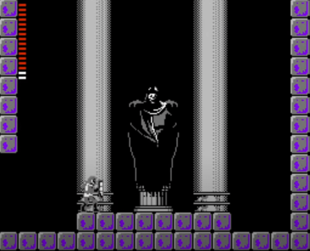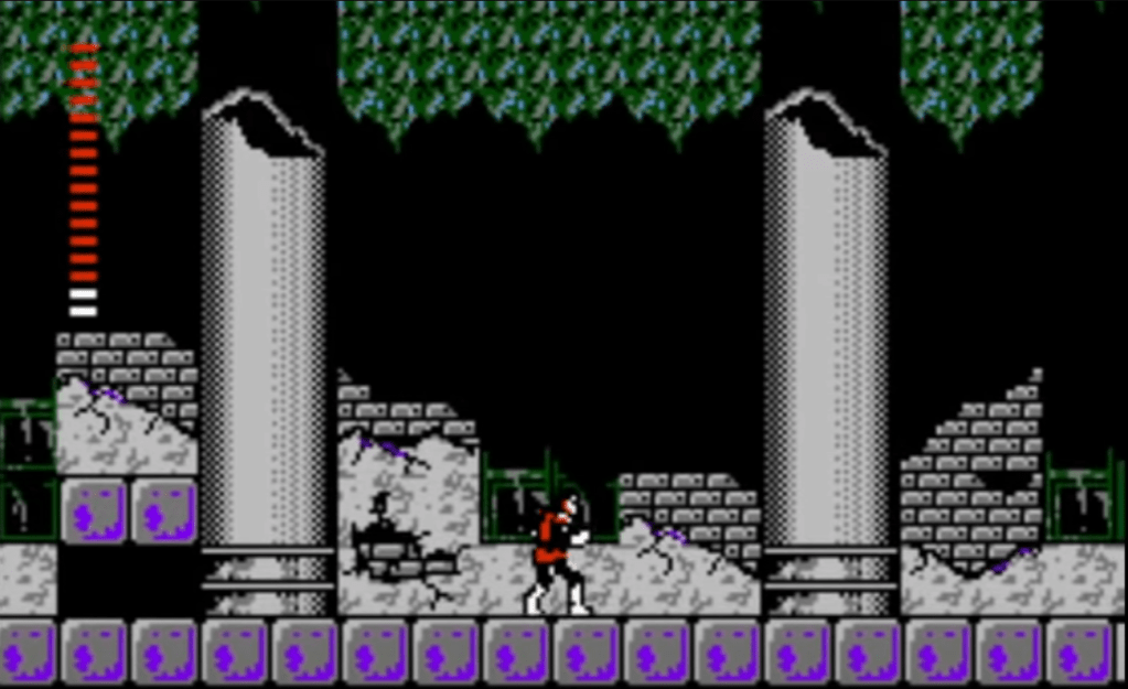 Todas as cenas aqui descritas, possuem detalhes criados pelo imaginário do jogador. Nessas cenas, repletas de pixels de várias cores, mal se pode chamar o conjunto de pixels cinzas, de estátua, muito menos de um cavaleiro. Assim eram muitos jogos nessa época. Imagens que davam a sugestão do fantástico, medonho ou macabro, o restante era questão do quanto a mente do jogador se permitiria afundar nesse mundo formado por pixels. E é aqui, que Simon tem seu súbito surto de raiva, onde começa a quebrar todos os braseiros, candelabros ou qualquer coisa que posso sequer parecer com um. Acredito ser genuinamente engraçado, vampiros guardarem armas e munições para as mesmas com seus monstros, e escondidas em seus candelabros e braseiros. E também, Simon pode encontrar escondido dentro de paredes falsas do castelo, itens de cura, simbolizado por um frango assado em um prato de prata. É muita gentileza de nosso anfitrião, Drácula. Pois, claro, o jogador precisa de itens para ficar mais forte, para se curar e etc… Coisa essa, diga-se de passagem, que foi copiada e reformulada por vários outros jogos de diferentes gêneros durante a história.
