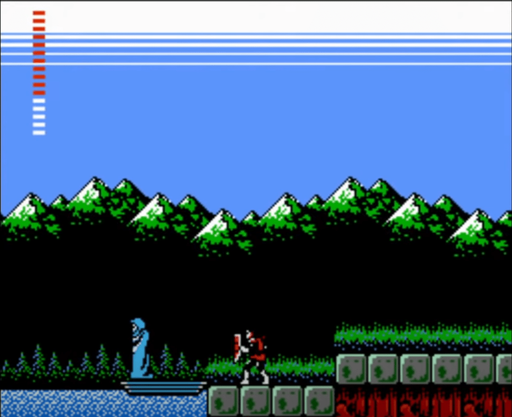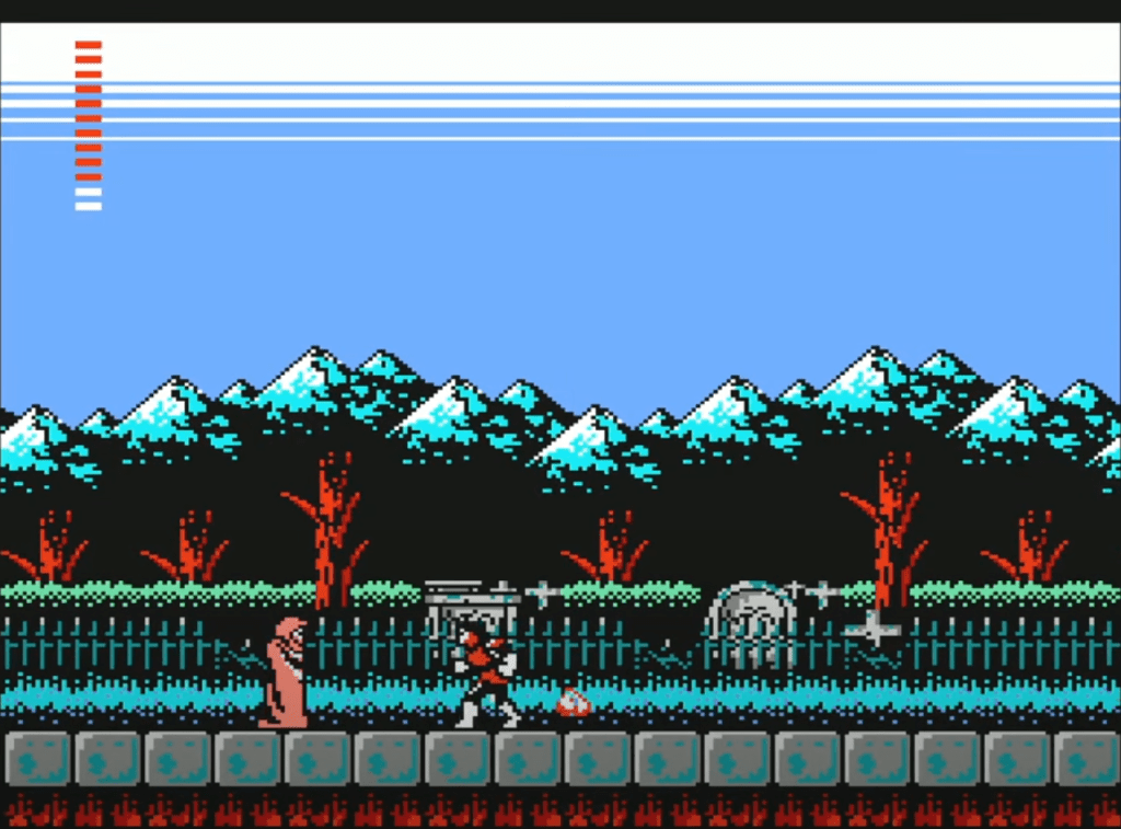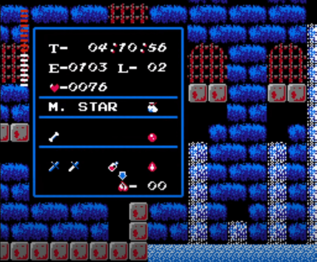 Em Castlevania II, o mundo se torna mais amplo e mais complexo que antes. Com vilas como centros para descanso e vários caminhos a seguir. Desta vez temos até mesmo diálogos com NPCs. Nem todos eles são úteis, claro, mas estão ali ao menos, como todo bom RPG, mas não chega nem perto das ‘complexas’ histórias contadas por Final Fantasy por exemplo. Histórias grandiosas com finais épicos, personagens marcantes e muitas cenas sobre o passado dos personagens e história geral do mundo. Castlevania II, molha os pés na piscina do RPG, mas não o suficiente para ser reconhecido por isso. No lugar, ele escolhe contar uma história mais condensada, uma jornada solitária de um homem, um herói gótico. Uma das grandes mudanças, foram os corações que tiveram sua utilidade aumentada, agora além de servirem de munição para algumas armas secundárias, eles também são moeda de troca para comprar itens nas vilas. Pois as criaturas não mais os derrubam (agora faz um pouco mais de sentido) e também servem de experiencia para Simon, que agora sobe de nível, aumentando sua vida e defesas. Temos até mesmo um menu de ‘inventario’, se assim pode se chamar. Onde podemos equipar e desequipar as várias armas adquiridas. Falando nisso, seu chicote, que era melhorado com os itens coletados, suas melhorias agora se tornaram itens compráveis nos mercadores e sua última evolução está escondida por aí pelo mundo em posse de uma figura, no mínimo questionável, esperando ansiosamente seu herói.