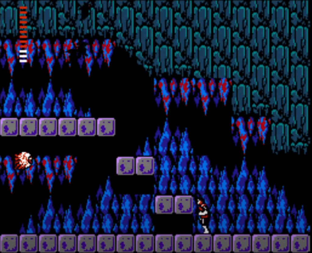 Não é só de armas que vive o homem. Temos agora itens que são necessários para a progressão do jogo, como o Crystal, que aparece na primeira vila, sendo vendido por um comerciante qualquer. Não me orgulho, de aqui de admitir, que fiquei muito tempo procurando o que fazer, até encontrar esse ‘Crystal Branco’ para comprar e depois troca-lo por um azul em uma vila seguinte. Vou deixar um momento para você tentar adivinhar o que eles fazem… pronto? Posso lhe dizer? Pois bem, eles são necessários para ver plataformas, invocar e encontrar caminhos escondidos para a progressão. Não é divertido? Passar horas andando de um lado para o outro, tentando encontrar o caminho correto para se seguir? Ao menos a recompensa de descobrir o que fazer vale o tempo perdido, ao menos para mim. Se você estiver perdido, sem paciência e irritado, é melhor encontrar um guia ou detonado. Pois principalmente com jogos desta época, a troca de informação é seu maior aliado. Muito por conta deste fato, que em seu lançamento, muitos fãs não gostaram da nova premissa, se sentiram traídos e queriam seu jogo de volta ao molde do primeiro, coisa que foi atendida, em partes. Já sua jogabilidade, continua travada. O que também pode ser dito por seu antecessor, mas como o jogo é menor e mais linear é o tipo de coisa que se perdoa, principalmente pela época na qual foi lançado (isso não justifica o fato de ser ruim e o personagem passa a sensação de ser ‘pesado’). Em sua sequência esperava que o controle de Simon estivesse mais responsivo, mas, como disse, não é o caso. Sobre as mortes, algo talvez recorrente, e que é um pouco diferente de seu antecessor. Em Castlevania II, ainda se mantém a quantidade de vidas dentro de uma tentativa, e cada morte, faz Simon perder os corações que coletou, mas, ainda mantendo suas armas, armas secúndarias e itens necessários para a progressão, diferente de seu antecessor que tira tudo que Simon tem e ainda o joga no começa da fase.